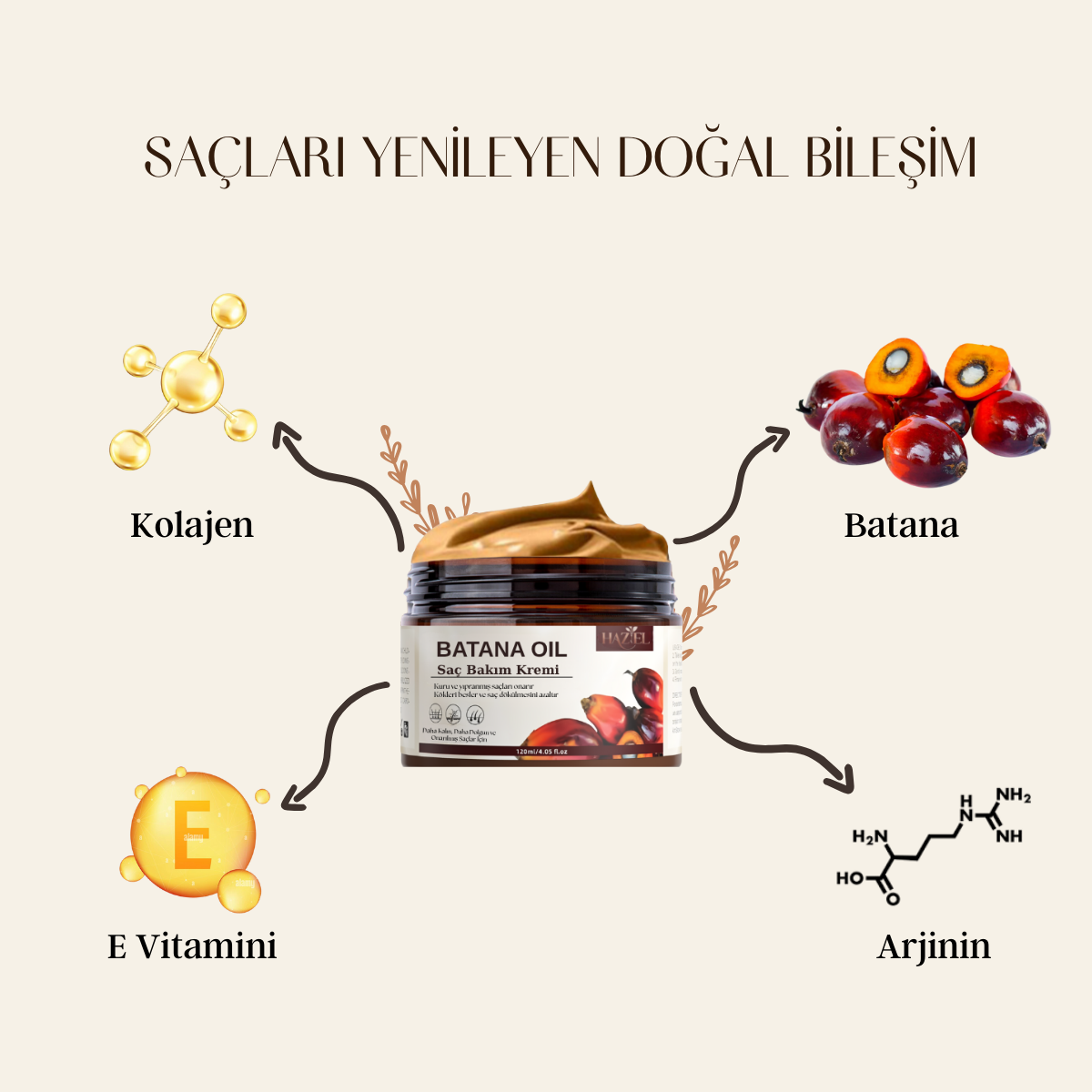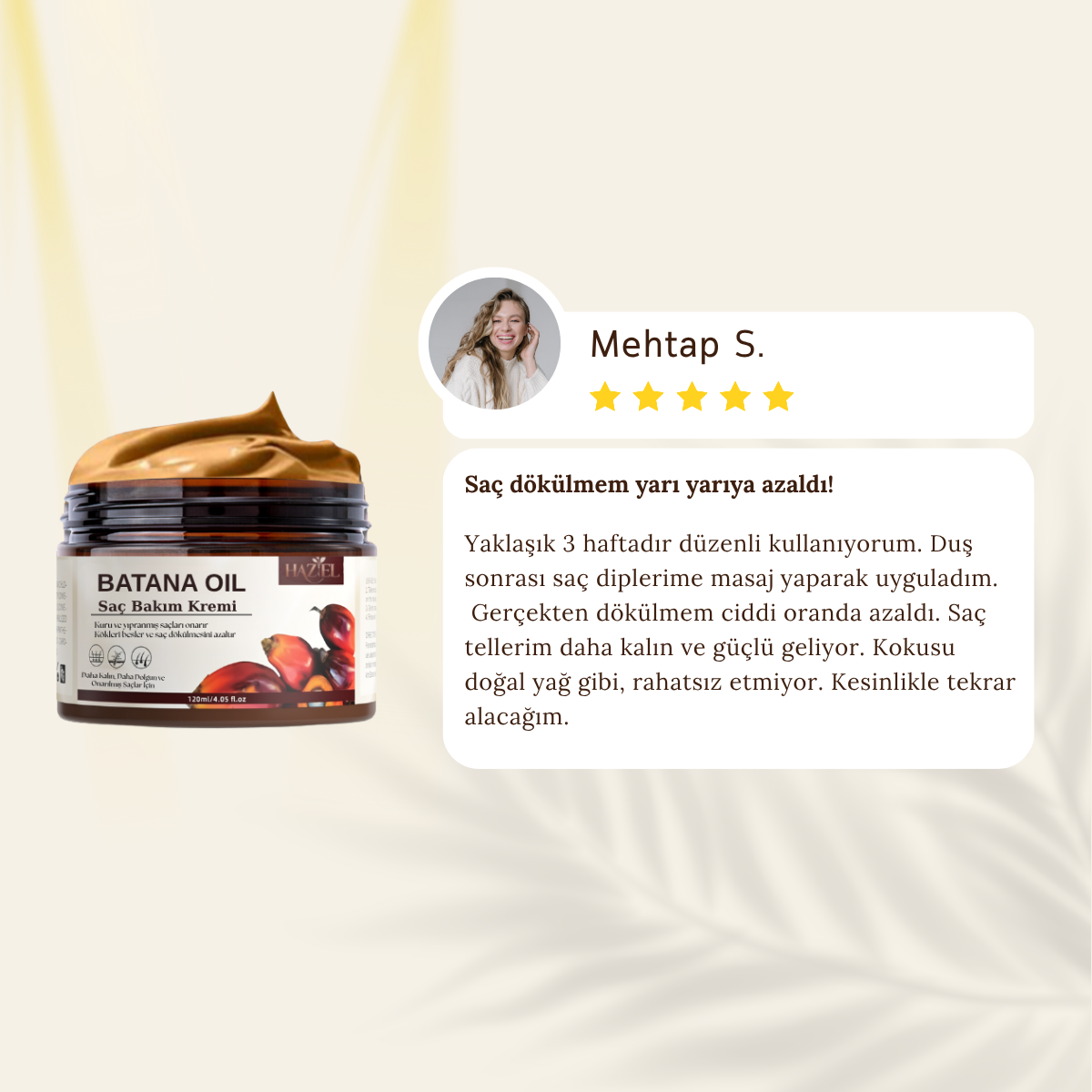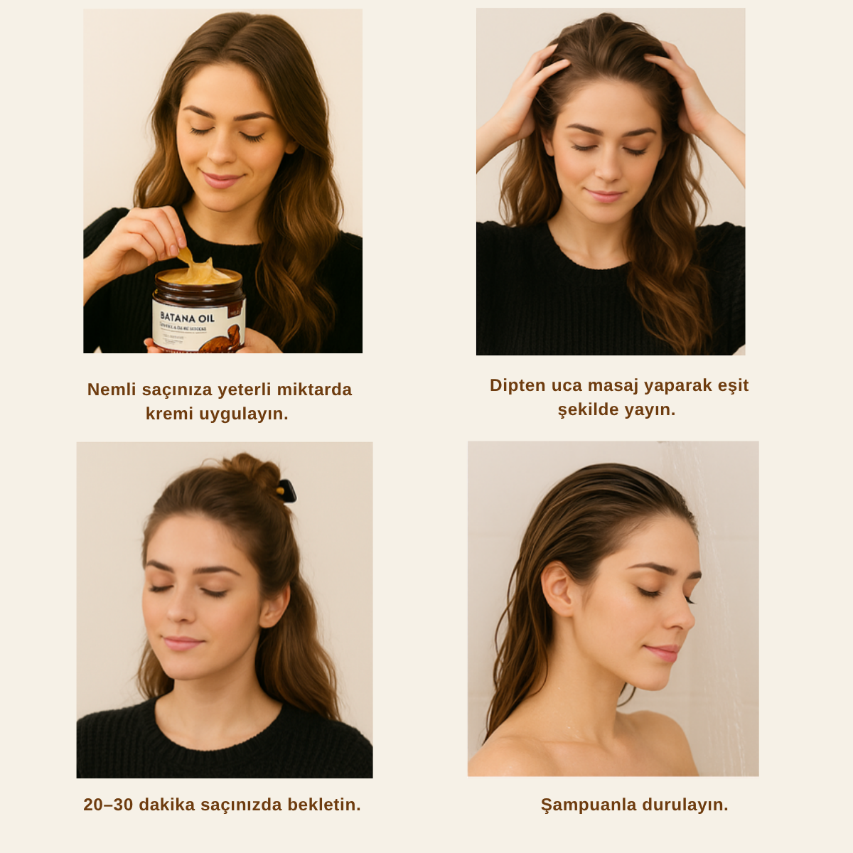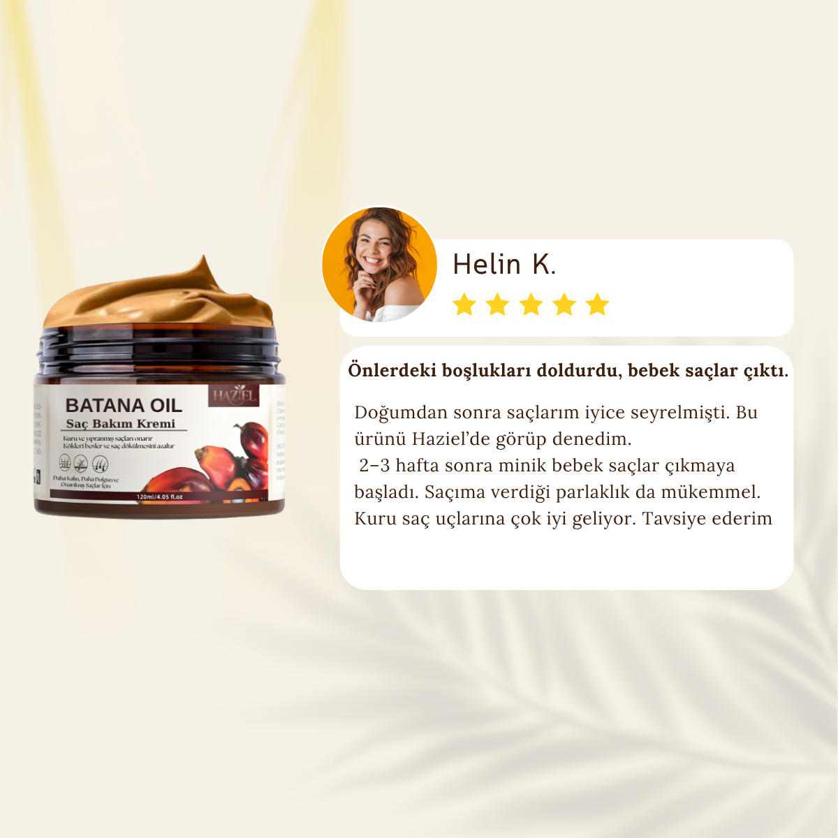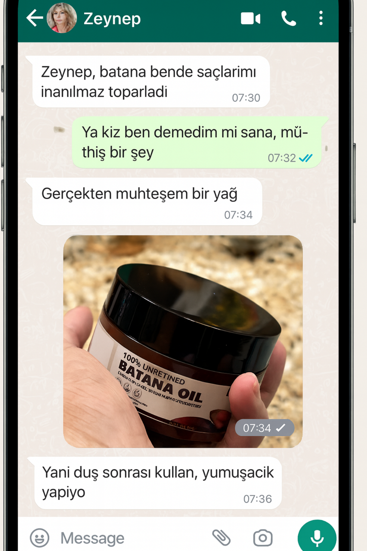 %100 saf Batana yağı; saç tellerini besleyen, onaran ve canlandıran doğal bir çözümdür. Kuru, yıpranmış, dökülen veya yavaş uzayan saçlara gözle görülür bir dönüşüm sağlar.